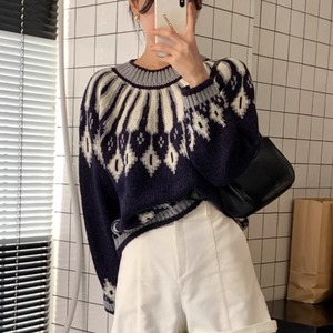 Round neck jacquard lantern sleeve knit 2colors RW0539