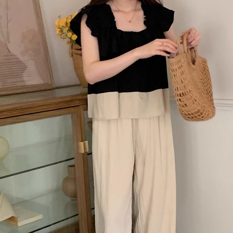 Square collar back ribbon tops and wide pants setup RW0767