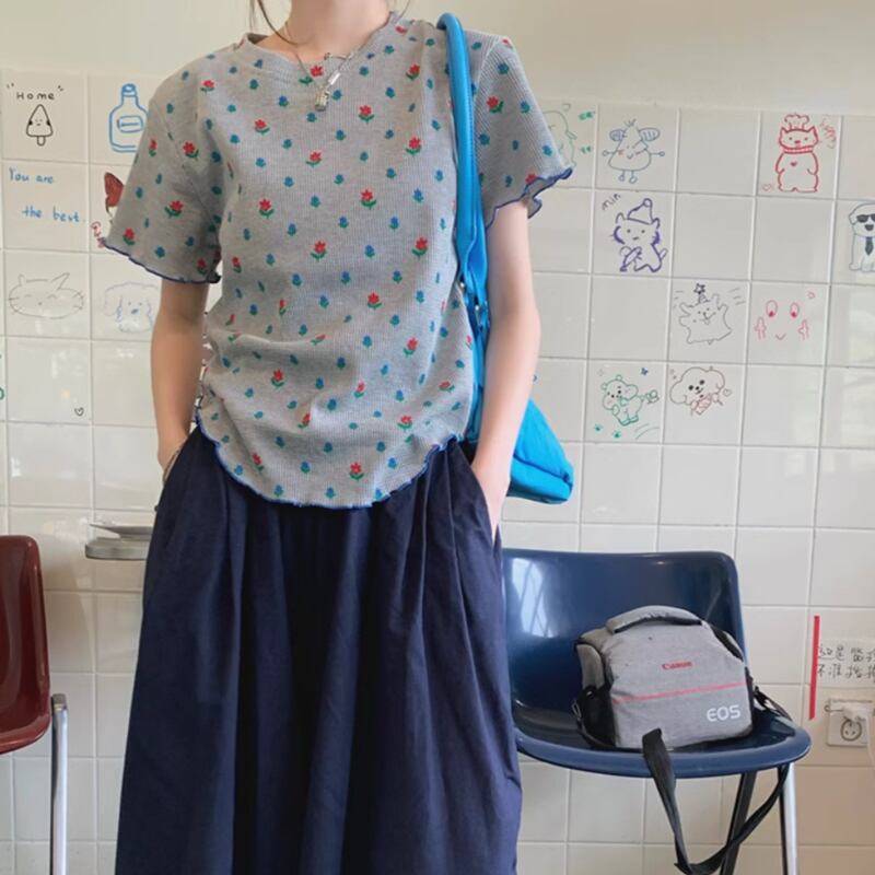 Flower half sleeve round neck tops RW0857