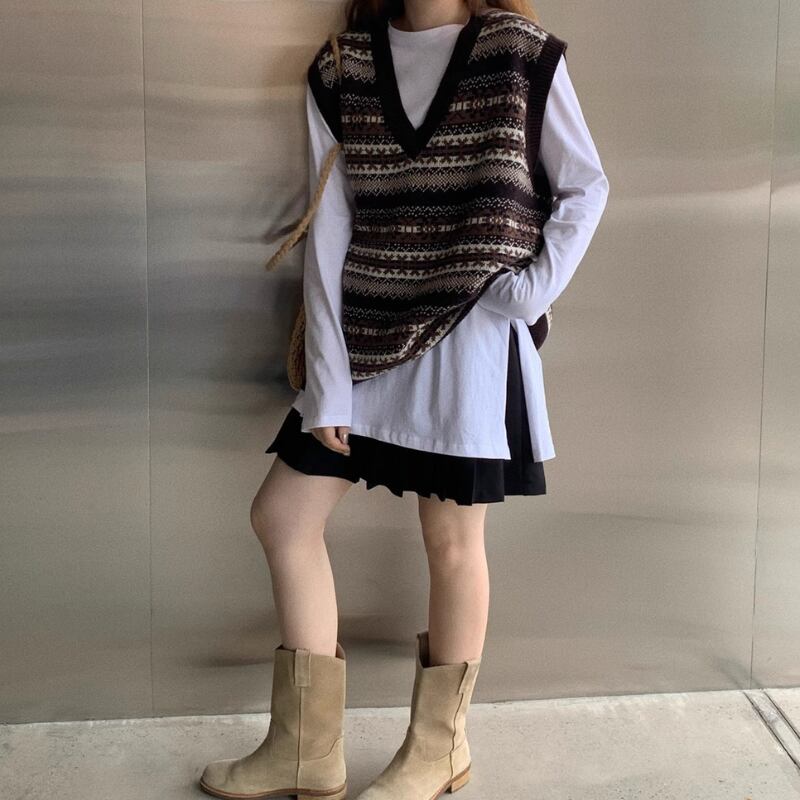カラー配色が特徴的なVネックニットベスト。レイヤードスタイルに最適で、カジュアルにもきれいめにも使える一枚です。