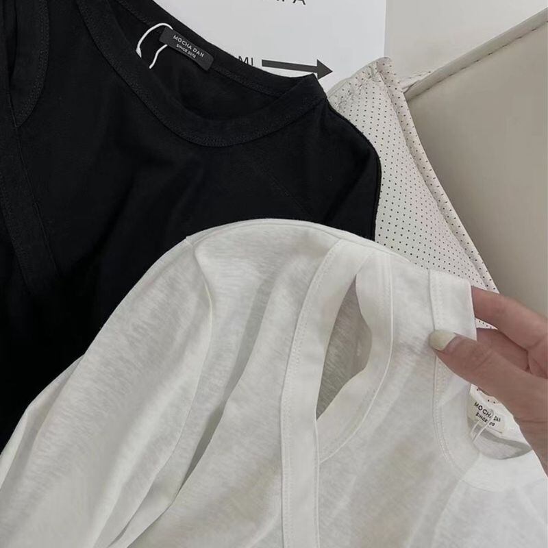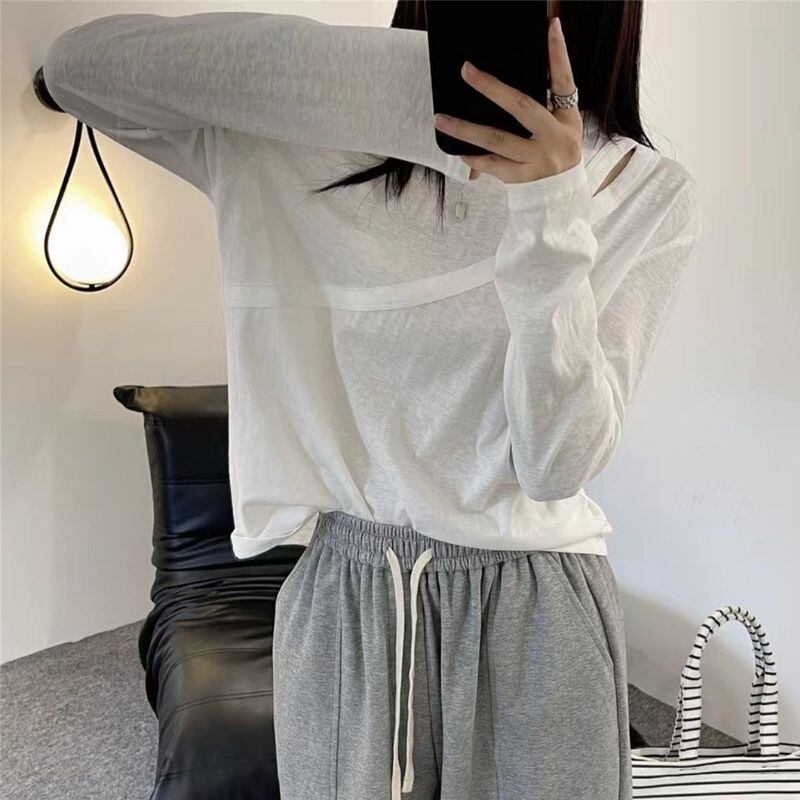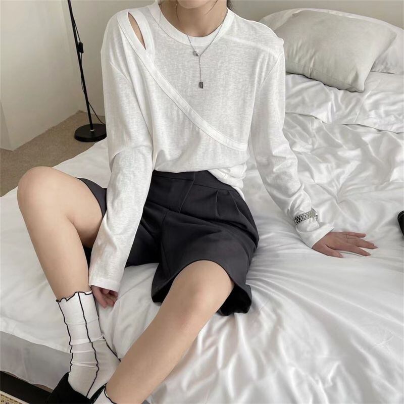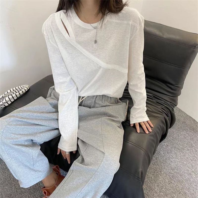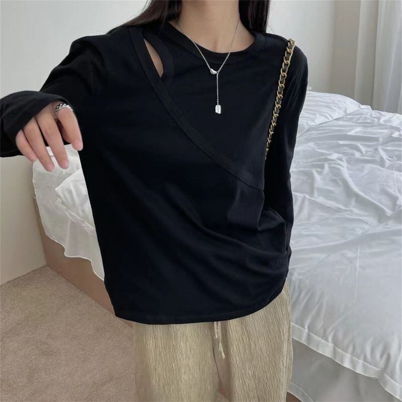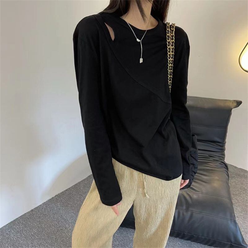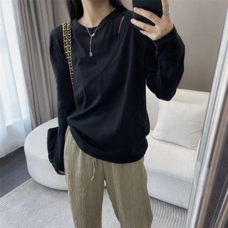 トレンド感あふれるアシンメトリーデザインの長袖トップス。洗練されたシルエットで、個性的かつエレガントな印象の一枚です。